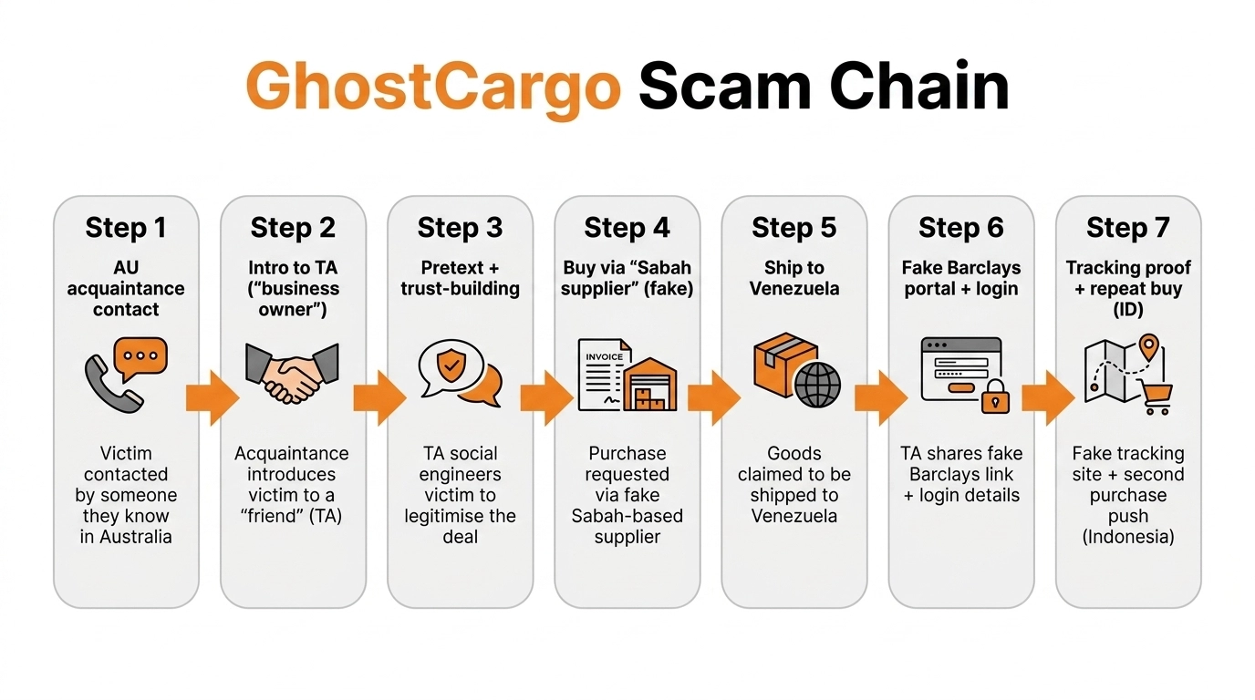 The GhostCargo scam chain combines social engineering, phishing infrastructure, and fabricated logistics to defraud victims. Initial contact comes through an acquaintance in Australia, who introduces the victim to their “friend” (the TA) presented as a business owner looking to purchase goods from Malaysia. The TA then builds credibility through sustained pretexting and persuasion, eventually asking the victim to arrange purchases via a supplier “based in Sabah” (a fake company), with the goods supposedly destined for Venezuela.