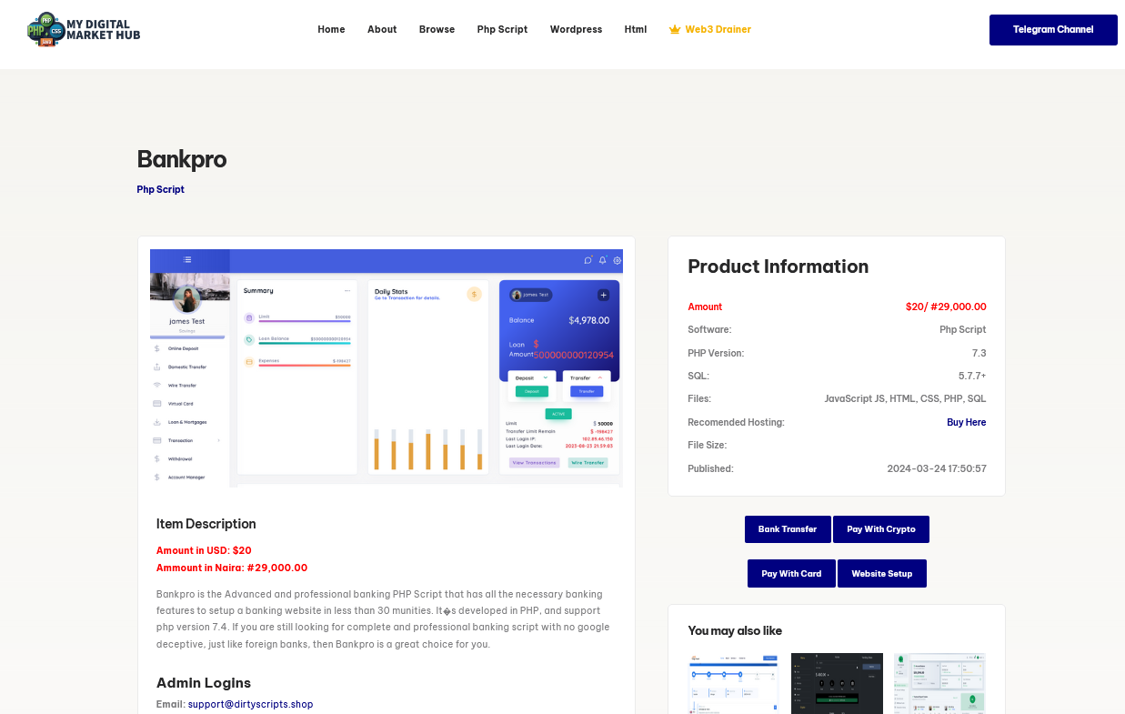 The screenshot above shows Bankpro's product listing on mydigitalmarkethub[.]com, one of the developer's own storefronts. The listing includes preview screenshots of the kit's admin dashboard and victim management panel, the $20 price point, default admin credentials, and an item description advertising it as an "online banking PHP Script built for the enterprise banking experience". The listing was captured before it was removed from the marketplace in April 2026.